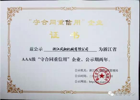 2018年7月榮獲浙江省工商行政管理局頒發的浙江省AAA級“守合同重信用”